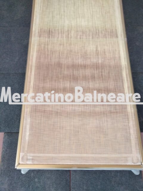 LETTINI USATI IN ALLUMINIO CON FINITURA BRONZO IN DISCRETE CONDIZIONI. TELAIO A 4 POSIZIONI SENZA COMPASSI. TELA IN TESSUTO PIENO COL. MELANGE ECRU IN CONDIZIONI SUFFICIENTI ( COME DA FOTO). TETTINO CON SERIGRAFIA “DELFINO CLUB”. Il prezzo s’intende per l’acquisto dell’intera partita ( I.V.A. ESCLUSA) Per l’acquisto di singole unità, si prega di richiedere preventivo. Trasporto escluso