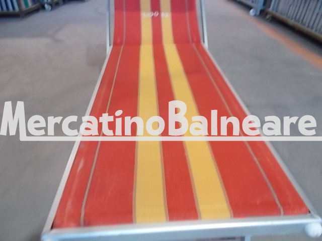 Lettini alluminio modello eccentrico, senza compassi, con telaio buoni e tele rosse a 2 bordi gialli con  scritta LIDO 92, e parasole blu Trasporto escluso