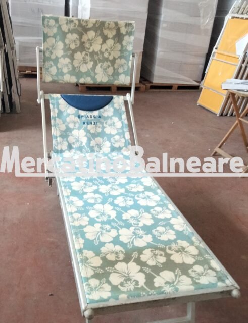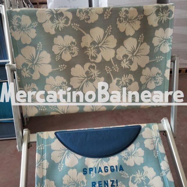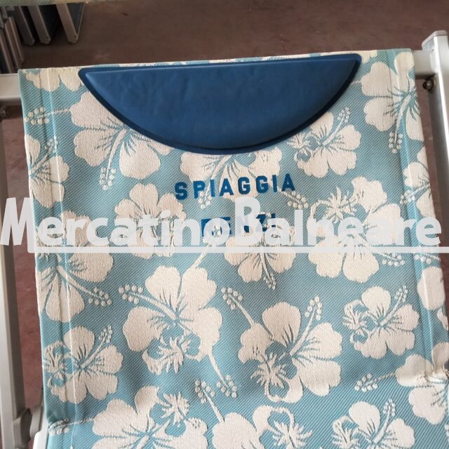 LETTINI IN ALLUMINIO USATI  CON TELAIO MOD.601 IN BUONO STATO. N. 20 A 3 POSIZIONI E N. 25 A 2 POSIZIONI. TUTTI I TELAI SONO SENZA COMPASSI TELA FLOREALE JAQUIO ACID FLOREAL ( CELESTE BIANCO) CON CUSCINO A MEZZALUNA COLORE BLU. TELA CON DICITURA “SPIAGGIA RENZI” TELA IN BUONE CONDIZIONI MA MACCHIATA IN ALCUNE ZONE( COME DA FOTO). Il prezzo s’intende I.V.A. esclusa. Il prezzo è per l’acquisito dell’intera partita; per l’acquisto di quantitativi inferiori, si prega di richiedere preventivo. Trasporto escluso