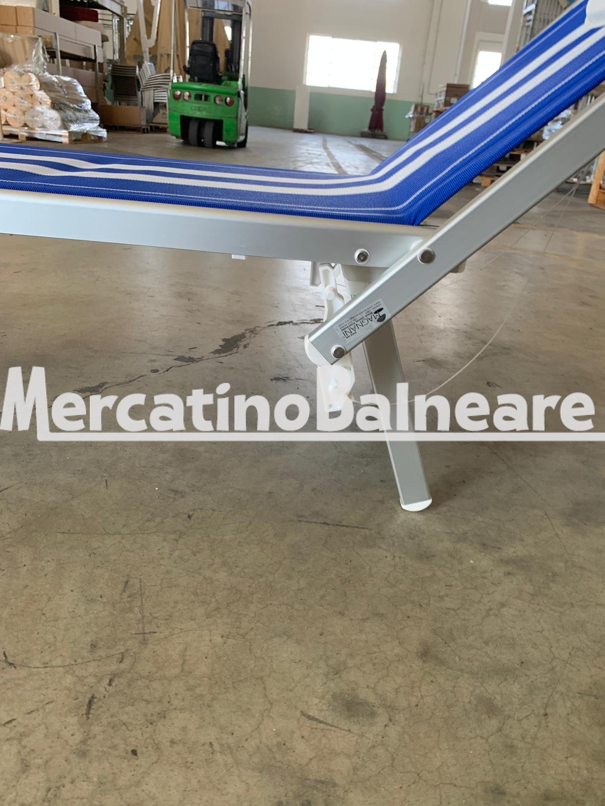 Indietro a LETTINO ALLUMINIO NUOVO 3 POSIZIONI TELA BLU A RIGHE BIANCHE CON CUSCINO
