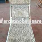 LETTINO USATO IN ALLUMINIO MOD. 501 RELAX A 3 POSIZIONI. TELAIO IN BUONO STATO SENZA COMPASSI. TELA CON TRAMA ANIMALIER JAQUIO TWIGA SAVANA LATO B IN BUONE CONDIZIONI, ALCUNE TELE SONO LEGGERMENTE MACCHIATE NELLA POSIZIONE DEI PIEDI (COME DA FOTO ALLEGATA) E TETTINO IN ABBINAMENTO CON DICITURA O SERIGRAFIA LETTINO MOLTO ELEGANTE E D’EFFETTO! Il prezzo s’intende per l’acquisto dell’intera partita (I.V.A. ESCLUSA). Per quantitativi inferiori, si prega di richiedere preventivo. Trasporto escluso