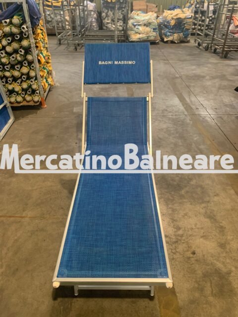 LETTINO USATO 2 POSIZIONI CON TELA BUONA BLU MELANGE TRAFORATA E SCRITTA SU PARASOLE