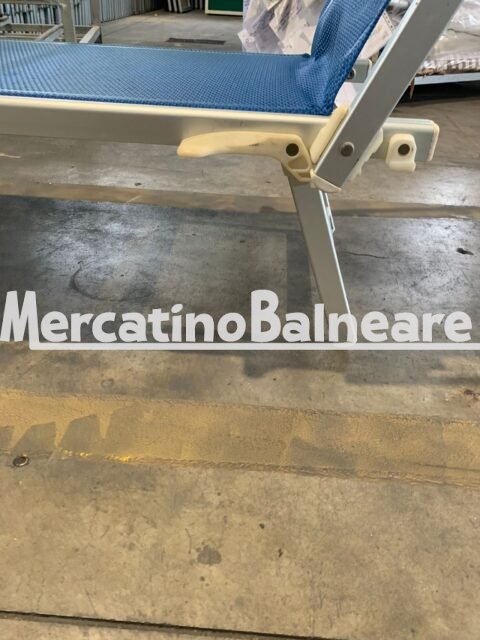LETTINO USATO 4 POSIZIONI SENZA STAFFE SENZA CORDA CON TELA SCARSA BLU TRAFORATA E SCRITTA SU PARASOLE