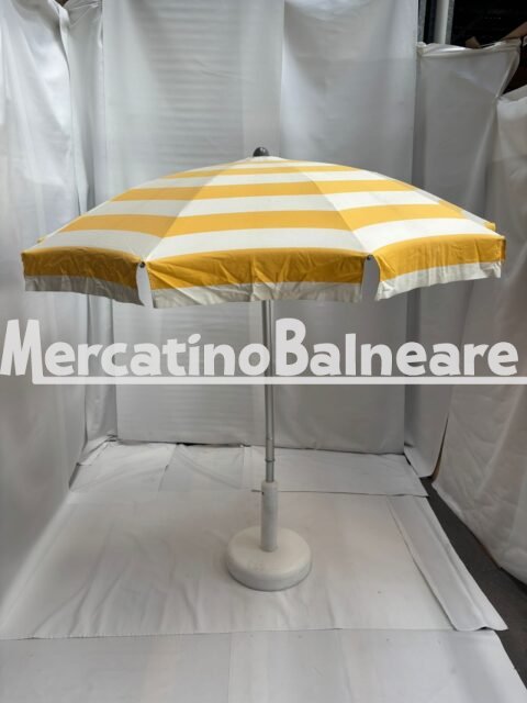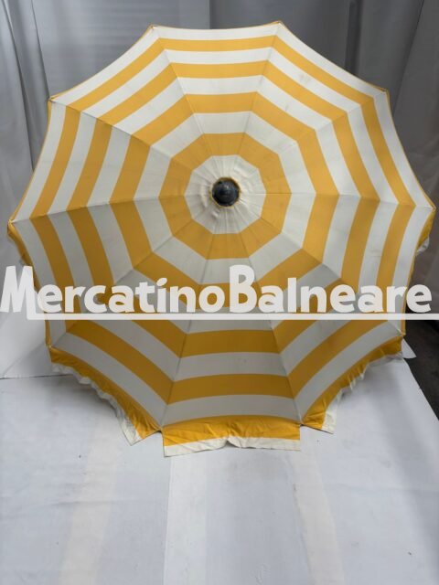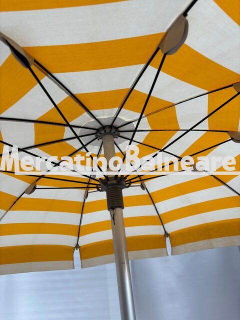 OMBRELLONE MIRO  USATO PRONTA CONSEGNA  10 STECCHE DA  100 CM  PER UN DIAMETRO DI CIRCA  200 CM STRUTTURA MODELLO TSC STECCA NERA COLLANO LEGA CON APPENDIABITI RAGNO MOLTO USATO MA FUNZIONALE PALO IN ALLUMINIO ANODIZZATO DA 40 DI CUI 9 CON FERMOVENTO SCIROCCO GLI ALTRI INVECE LISCI TESSUTO TEMPOTEST 37/1 BIANCO GIALLO RIGATO REGOLARE USATO MA FUNZIONALE PREFERIAMO LA VENDITA DI TUTTA INTERA PARTITA PER RICHIESTE DI QUANTITA’ INFERIORI CI RISERVIAMO DI VALUTARLE Vendibili singolarmente Prezzo franco fabbrica escluso della parte inferiore