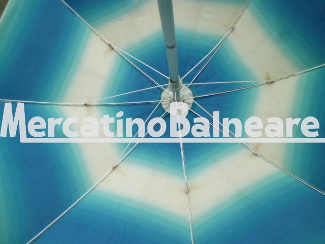 OMBRELLONE USATO PRONTA CONSEGNA MODELLO BABY 8 STECCHE 4,2  DA CM. 100  SENZA APPENDIABITI PRODOTTO USATO MA FUNZIONALE PALO ALLUMINIO BABY DA MM 35 CON SNODO TESSUTO ACRILMARE SFUMATO BLU BIANCO Vendibili singolarmente Prezzo franco fabbrica escluso della parte inferiore