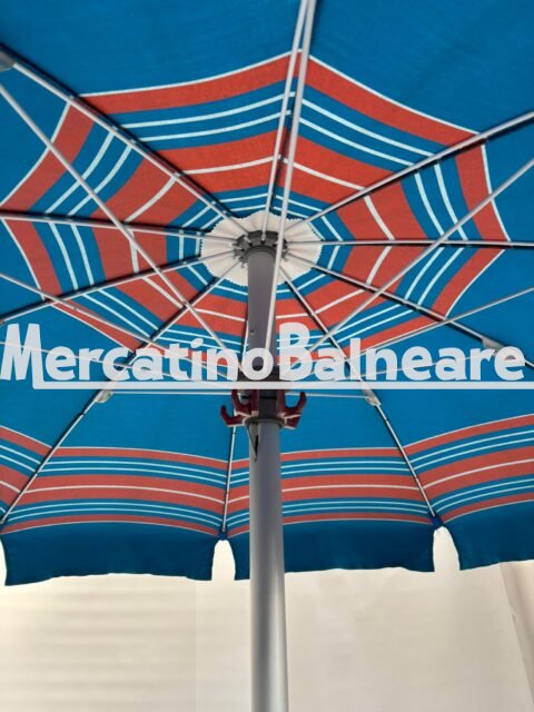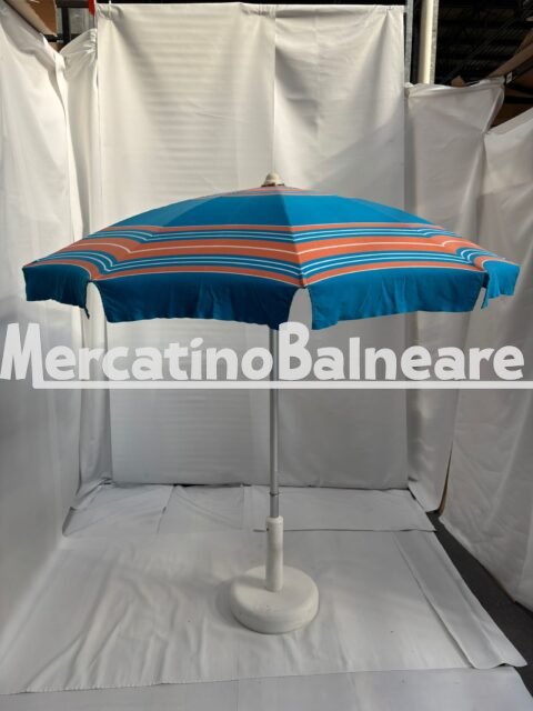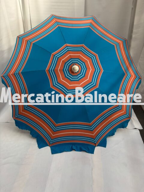 OMBRELLONE MIRO  USATO PRONTA CONSEGNA  10 STECCHE DA  100 CM  PER UN DIAMETRO DI CIRCA  200 CM STRUTTURA MODELLO VECCHIO RAGNO COLLANO LEGA CON APPENDIABITI RAGNO MOLTO MOLTO USATO CON STECCHE OSSIDATE MA FUNZIONALE PALO IN ALLUMINIO ANODIZZATO DA 40 mm CON ANTIVENTO BAIONETTA TESSUTO ACRILMARE RASATO CELESTE FASCIA ARANCIO MOLTO USATO MA FUNZIONALE Vendibili singolarmente Prezzo franco fabbrica escluso della parte inferiore