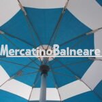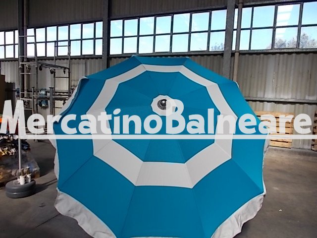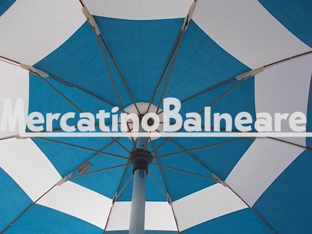 OMBRELLONE USATO CON TELA NUOVA   PRONTA CONSEGNA DI NOSTRA PRODUZIONE RICAMBI SEMPRE DISPONIBILI STRUTTURA RAGNO STECCHE 4,7 mm  SENZA APPENDIABITI  PALO IN ALLUMINIO 38 TESSUTO NUOVO CON DUE ANNI DI GARANZIA CELESTE BIANCO FUORI MAZZETTA  PARTE INFERIORE DA DEFINIRE  Vendibili singolarmente Prezzo franco fabbrica escluso della parte inferiore