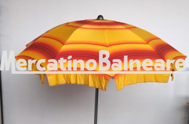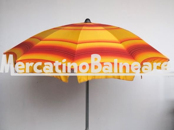 OMBRELLONE CLASSICO CON N. 10 STECCHE DA CM. 100 IN DISCRETE CONDIZIONI. PALO SUPERIORE IN ALLUMINIO CON INNESTO BAIONETTA ANTIVENTO. CHIUSURA PRESTIGE  COPERTURA IN BUONO STATO A RIGHINE SFUMATO ROSSO/GIALLO. Il prezzo s’intende per l’acquisto dell’intera partita. I.V.A. esclusa Per l’acquisto di singole unità, richiedere preventivo. Vendibili singolarmente Prezzo franco fabbrica escluso della parte inferiore