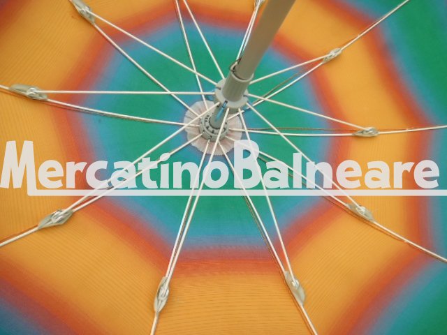 OMBRELLONE USATO PRONTA CONSEGNA MODELLO RICCIONE COLLANO CORTO RICAMBI SEMPRE DISPONIBILI  DIAMETRO 200 DOTATO DI APPENDIABITI FISSO  TESSUTO ARCOBALENO PALO ALLUMINIO 40 SENZA STAMPA  STECCHE OSSIDATE Vendibili singolarmente Prezzo franco fabbrica escluso della parte inferiore