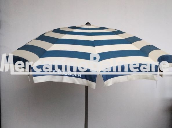 OMBRELLONE CLASSICO CON PANTA CON N. 10 STECCHE DA CM. 100 IN BUONE CONDIZIONI. PALO SUPERIORE IN ALLUMINIO BAIONETTA. COPERTURA A RIGHE BLU E BIANCHE IN BUONE CONDIZIONI. (N. 3 OMBRELLONI HANNO LA DICITURA “LA BUSSOLA” Il prezzo s’intende per l’acquisto dell’intera partita. I.V.A. esclusa. Per l’acquisto di singole unità, richiedere preventivo. Vendibili singolarmente Prezzo franco fabbrica escluso della parte inferiore