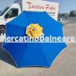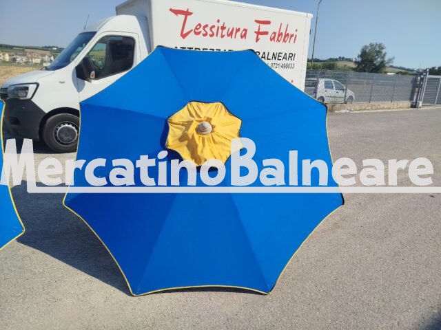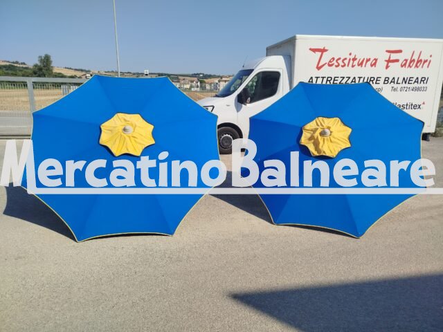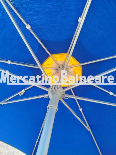 OMBRELLONE USATO MOD. PICASSO TONDO. DIAM. 250. SISTEMA DI APERTURA/CHIUSURA DIAMANTE ANTINFORTUNISTICO, SENZA USO DI GANCI O BOTTONI. PALOSUPERIORE IN ALLUMINIO INNESTO DIAM. 40 H. 165 COPERTURA IN TESSUTO TEMPOTEST PARA’ BLU CON BORDINO GIALLO, SOFFIETTO ANTIVENTO GIALLO RIFINITO BORDINO BLU. BOCCO STECCA IN BUONO STATO. COPERTURA IN BUONO STATO. (PRESENZA DI ALCUNE RIPARAZIONI GIA’ ESEGUITE). Vendibili singolarmente Prezzo franco fabbrica escluso della parte inferiore
