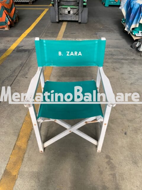POLTRONCINA MODELLO REGIISTA PIEGHEVOLE IN LEGNO  TELAIO VERNICIATO BIANCO SCOLORITO MA PERFETTAMENTE FUNZIONALE,  TELA VERDE UNITO IN BUONE CONDIZIONI CON SCRITTA “B. ZARA” PREZZO PER CADAUNA SEDIA  ACQUISTABILI ANCHE SINGOLARMENTE IVA E TRASPORTO ESCLUSO Trasporto escluso